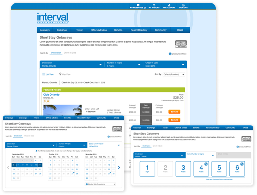 I redesigned Interval’s booking experience to support short-getaway vacations and boost revenue. The new UX adapts to both traveler types: destination-first users see options starting with location, nights, and check-in; date-first users start with check-in, nights, then destination. This dual-path flow simplified complex inventory rules and empowered users to book the way they plan—driving adoption and unlocking new revenue streams.