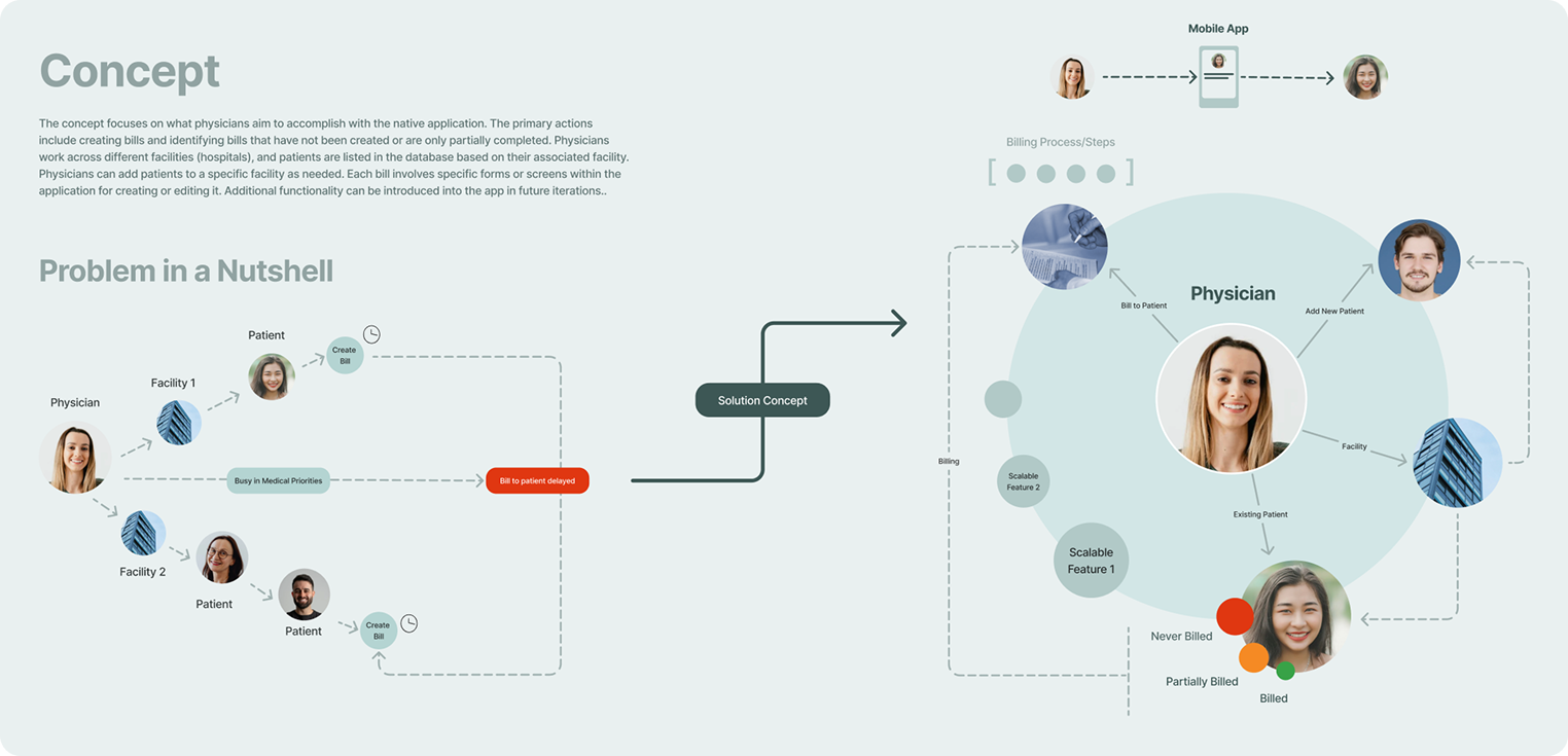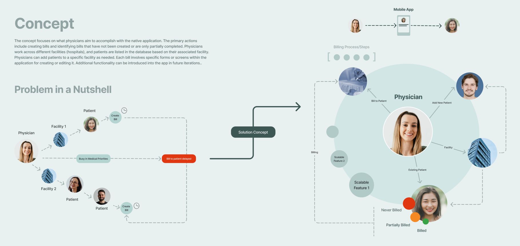 The product vision was to create a mobile-first billing application that empowers physicians to complete billing tasks quickly and accurately at the point of care. The app needed to be simple, intuitive, and context-aware, reducing administrative burdens while seamlessly integrating into physicians’ daily workflows. From a business perspective, the goal was to address the revenue loss caused by delayed and incomplete billing in the existing desktop system.