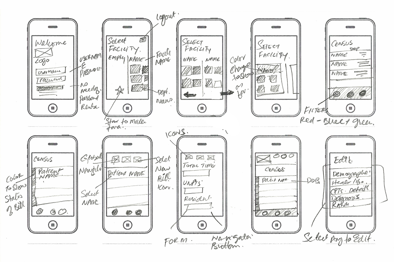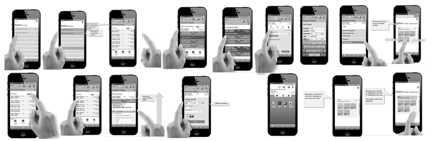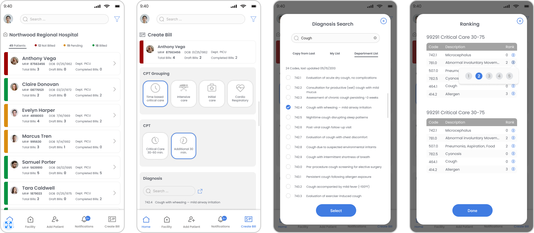 My goal was to foster a collaborative environment tailored to stakeholder comfort levels to extract the best input possible. Once all ideas were on the table, we separated realistic application goals from desirable features, clarifying which user tasks would be prioritized. Throughout these sessions, the in-house mobile development team provided critical feedback, sharing IT infrastructure limitations and technical feasibility. Their insights shaped core functionalities such as patient search, adding new patients, creating bills, and completing incomplete billing tasks. Key features like visual billing status indicators, favorite diagnosis codes, and prompts for unbilled or incomplete bills were also identified as essential to improving the user experience.