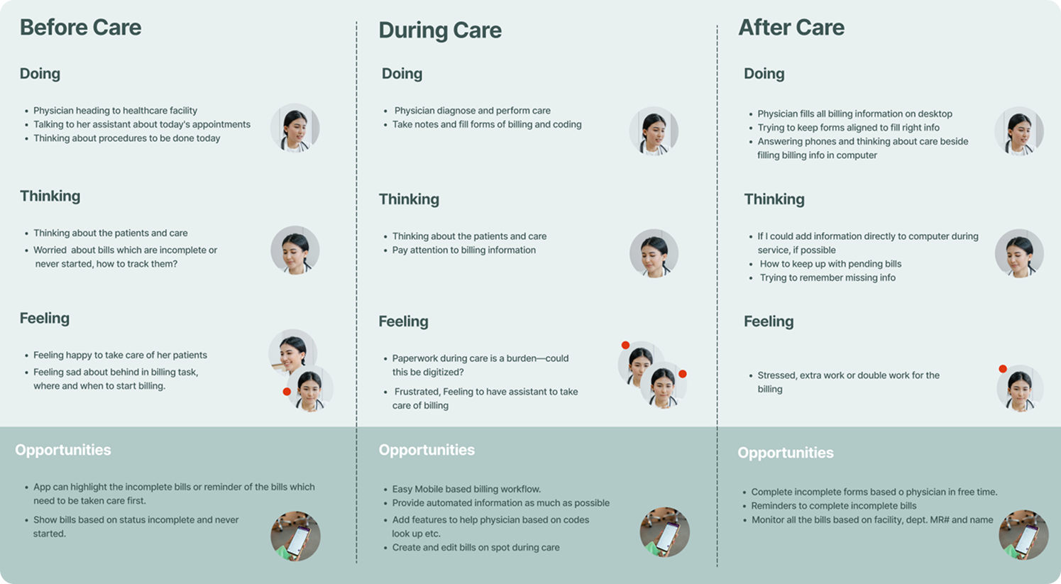 To solve the core problem—helping physicians stay on top of their billing tasks without interrupting patient care—I began by mapping out the user journey. I focused on the before, during, and after phases of their workflow to identify needs, friction points, and opportunities. The "before" phase emerged as critical, where physicians needed timely alerts about new patients, bills to create, or incomplete records. However, both "during" and "after" phases also held strong potential to boost productivity—especially with features like autosave during patient visits and quick access to pending tasks afterward.