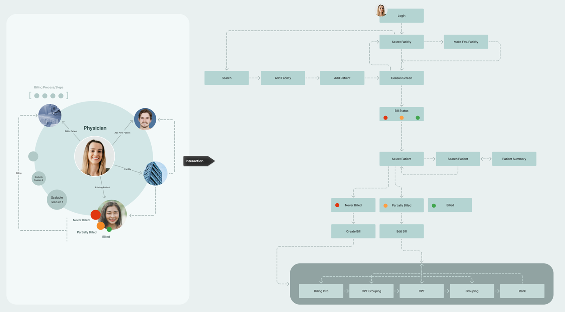 To visualize the billing workflow from the physicians’ perspective, I developed user journey maps informed by our research. These visualizations helped identify friction points and areas of opportunity. One critical insight emerged during both the journey mapping and interview sessions: physicians had no reliable way of being reminded about incomplete bills that still needed to be submitted. This gap not only caused delays in the billing process but also directly affected revenue flow.