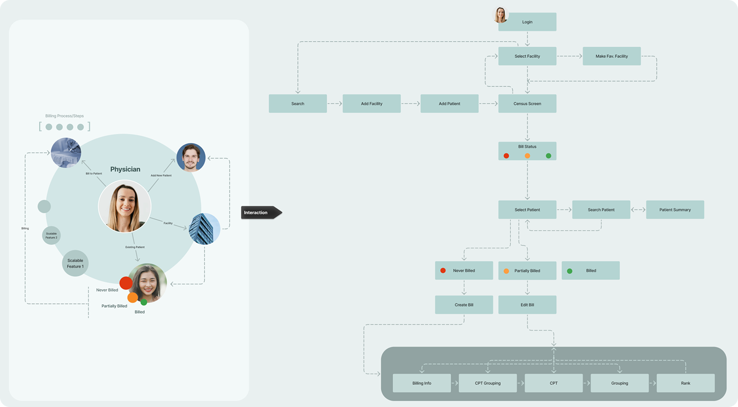 I created a comprehensive information architecture aligned with the user journey map. It clearly outlined what physicians needed at each step and what features could best support them. This structure helped me visualize and prioritize solutions addressing gaps like reminders for unfinished bills, efficient patient lookups, and seamless resumption of saved drafts.