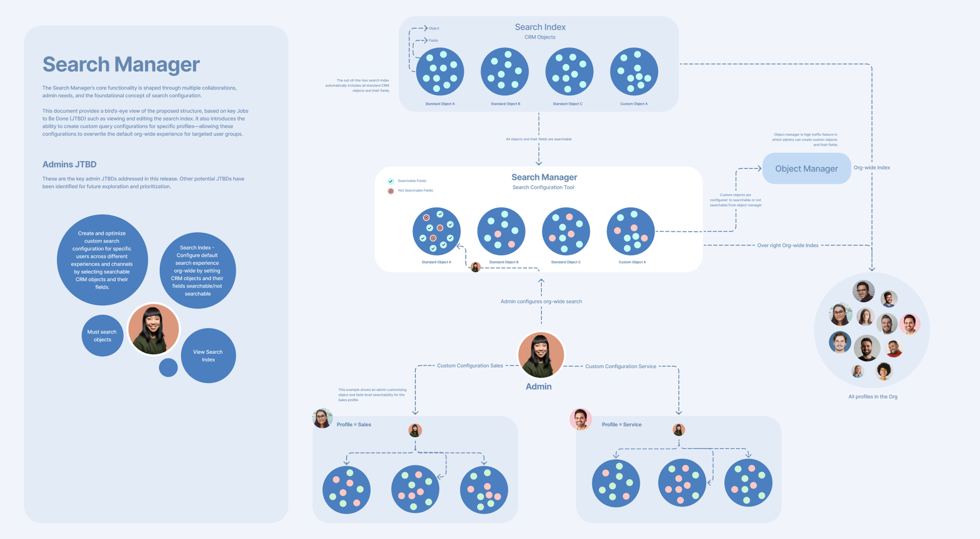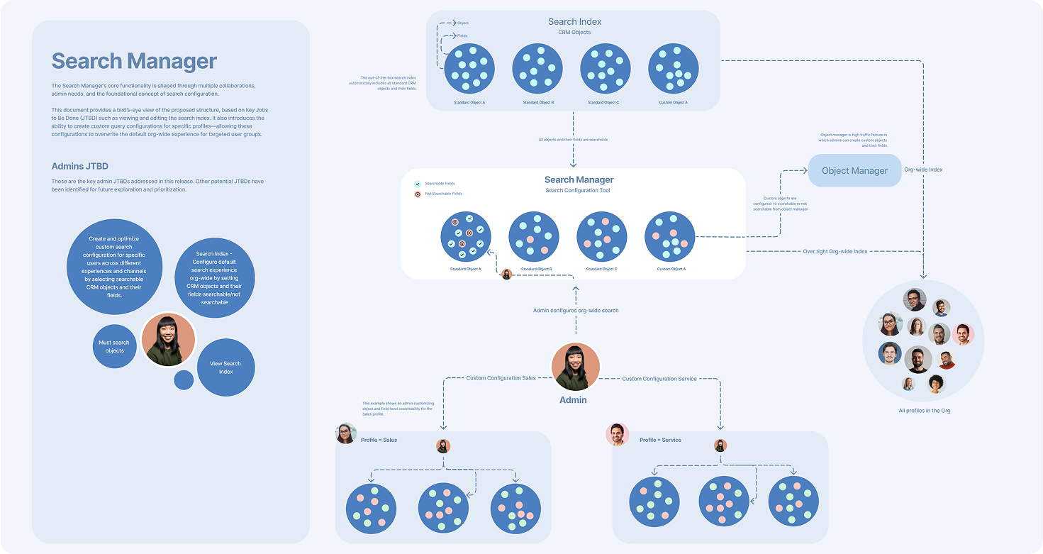 As Salesforce’s Einstein Search grew in adoption, a new challenge emerged: Admins and end-users were overwhelmed by irrelevant search results. Admins lacked control over which objects and fields appeared in results across different user profiles and search experiences. I led UX efforts to build Search Manager from the ground up—a no-code configuration tool enabling Admins to customize the search experience across Salesforce products, aligning with SLDS and core platform mental models.