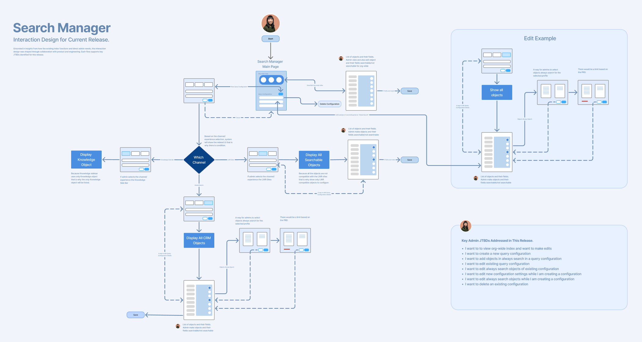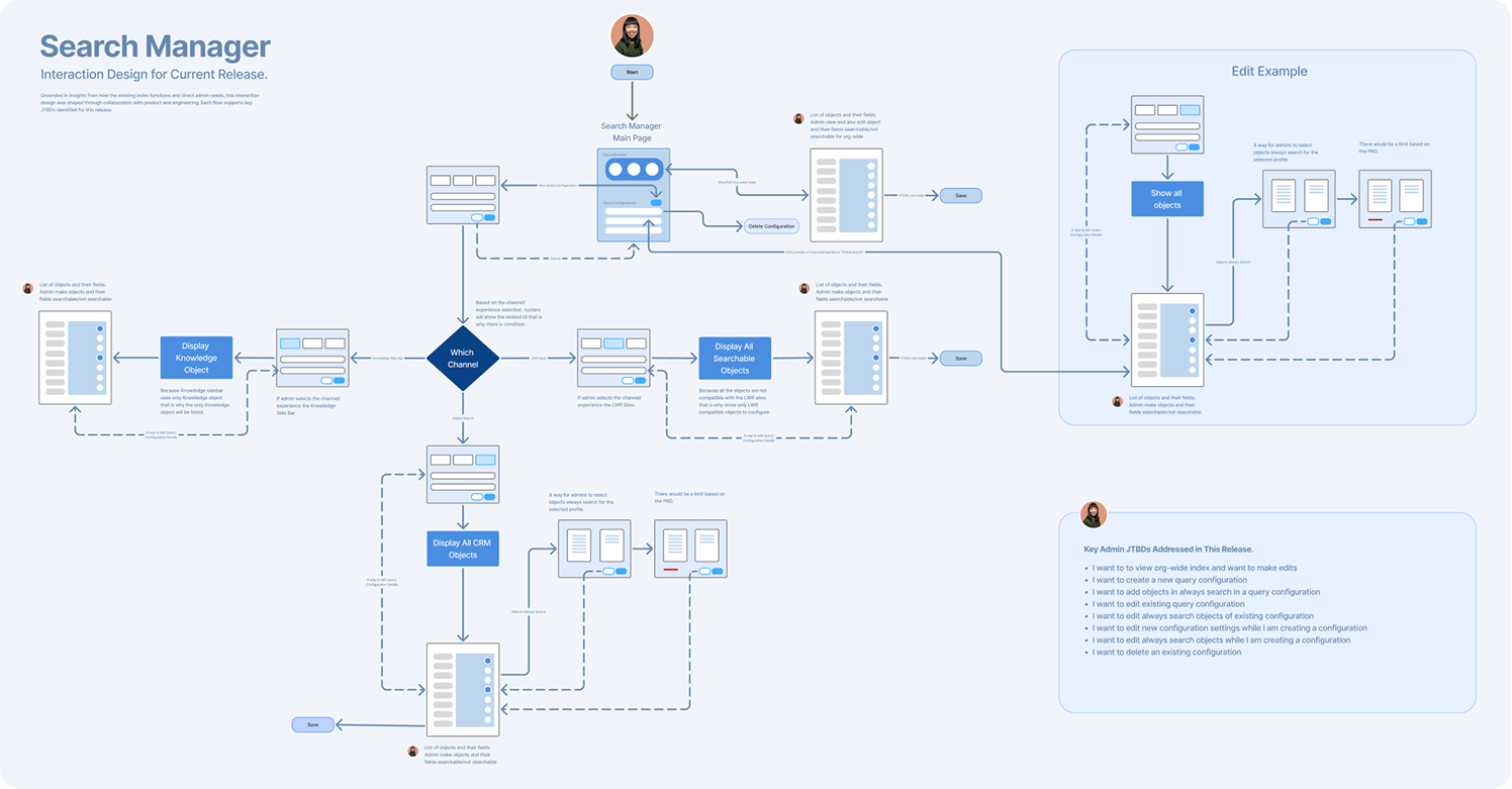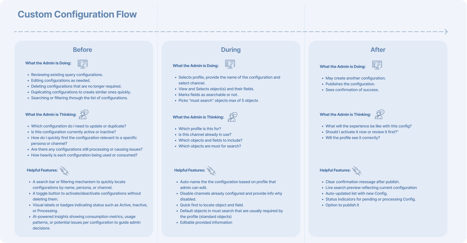 Design began with a core question: How can we support Admins in their flow of work without slowing them down? I grounded my interaction design in real user moments, using a "before → during → after" framework to evaluate needs across the configuration journey. After mapping detailed interaction flows for the two core paths—org-wide index and profile-based configurations—I created a JTBD chart divided into before, during, and after phases, outlining the specific information, interactions, and experiences Admins require at each stage. This chart became a central tool during ideation, helping me focus screen design efforts on solving real user needs.